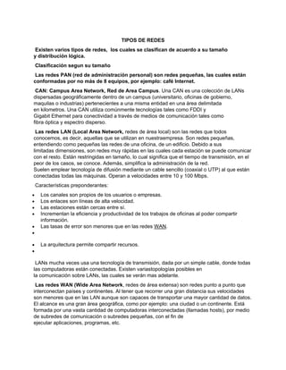 Existen varios tipos de redes clasificadas según su tamaño y distribución lógica, incluyendo PAN, CAN, LAN, WAN, MAN e Internet Works. LAN son redes pequeñas como una oficina o edificio que operan a altas velocidades, mientras que WAN son redes más grandes que conectan países y continentes a velocidades menores. Dentro de una organización, las LAN a menudo se conectan a WAN para acceder a servicios como Internet.