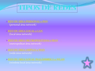 Existen diferentes tipos de redes informáticas que se clasifican según su alcance geográfico, incluyendo las redes de área personal o PAN, las redes de área local o LAN, las redes de área metropolitana o MAN, las redes de área amplia o WAN, y las redes de área local inalámbricas o WLAN. Cada tipo de red se caracteriza por su alcance y velocidad de transmisión de datos.