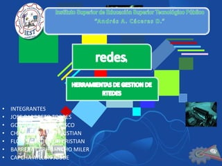 Este documento presenta una lista de integrantes de un proyecto que incluye los nombres de Jose Barreto Torres, Gozar Arias Francisco, Chagua Vivanco Cristian, Flores Castillon Cristian y Barrera Carhuancho Miler. Además, describe diferentes tipos de redes como LAN, WAN, SAN, VLAN y sus características. Finalmente, explica las principales topologías de red como bus, anillo, estrella, árbol, malla y sus características distintivas.