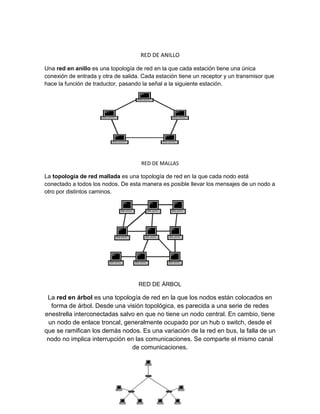 El documento describe los diferentes tipos de redes, incluyendo redes punto a punto, de bus, de estrella, de anillo, de mallas, de árbol, híbridas y de margarita. Cada tipo tiene una topología distinta para la conexión y comunicación entre dispositivos en una red.