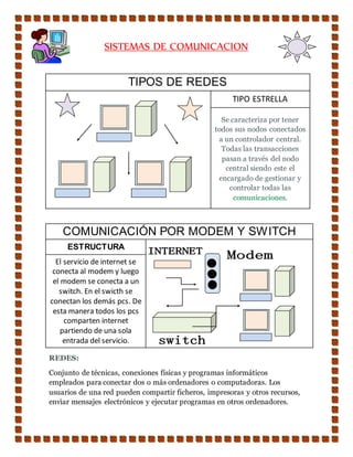 El documento describe cómo un modem conecta un servicio de internet a un switch, el cual conecta varios PCs para que puedan compartir la conexión a internet. Explica que las redes permiten conectar ordenadores para compartir archivos, impresoras y otros recursos. Además, describe una red en topología estrella, donde todos los nodos se conectan a un controlador central que gestiona las comunicaciones.