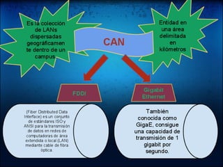 Este documento describe los diferentes tipos de redes, incluyendo PAN, LAN, WAN y CAN. Explica que la red PAN se usa comúnmente en cafés de internet y tiene una topología en línea o de bus. La red LAN es para empresas pequeñas y puede tener una topología de anillo, árbol o estrella. La red WAN conecta países y continentes de forma punto a punto y es más lenta que las LAN. La red CAN conecta LAN dispersas geográficamente.