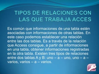 Existen tres tipos de relaciones entre tablas en Access: 1) uno a uno, donde cada registro de una tabla solo se relaciona con un registro de otra tabla; 2) uno a varios, donde un registro de una tabla se puede relacionar con múltiples registros de otra tabla pero no viceversa; y 3) varios a varios, donde se requiere una tabla de combinación para relacionar múltiples registros entre dos tablas.