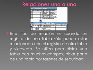 Este documento describe tres tipos de relaciones entre tablas en bases de datos: una relación uno a uno donde cada registro solo puede relacionarse con un registro en la otra tabla; una relación uno a muchos donde un registro en la tabla principal puede relacionarse con múltiples registros en la secundaria pero no viceversa; y una relación de muchos a muchos donde los registros en ambas tablas pueden relacionarse con múltiples registros en la otra tabla.
