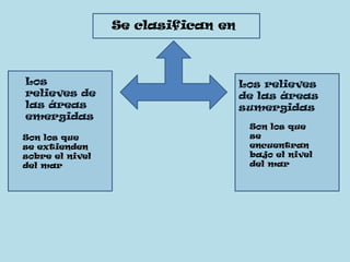 Este documento clasifica los diferentes tipos de relieve en dos categorías: los relieves de las áreas emergidas, que se extienden sobre el nivel del mar e incluyen cordilleras montañosas, llanuras y depresiones; y los relieves de las áreas sumergidas, que se encuentran bajo el nivel del mar e incluyen dorsales, plataformas continentales, llanuras abisales y fosas. También menciona las islas y colinas volcánicas.