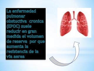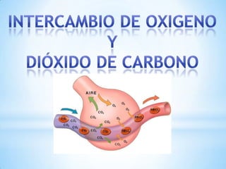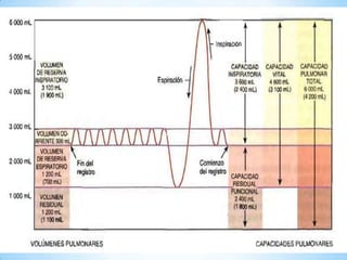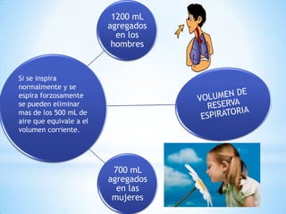 El documento describe los volúmenes pulmonares y el intercambio de gases en los pulmones. Explica que el volumen de reserva en mujeres promedio es de 1900 mL y 1200 mL en hombres. El intercambio de oxígeno y dióxido de carbono entre el aire alveolar y la sangre pulmonar ocurre por difusión pasiva según las leyes de Henry y Dalton, donde cada gas se difunde de acuerdo a su presión parcial. Este proceso convierte la sangre desoxigenada en sangre oxigenada lista para ser bombeada