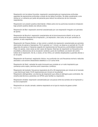 El documento describe diferentes tipos de respiración, incluyendo la respiración abdominal, la respiración de Cheyne-Stokes, y la respiración diafragmática. La respiración abdominal involucra principalmente al diafragma y los músculos abdominales, mientras que la respiración de Cheyne-Stokes se caracteriza por períodos alternantes de apnea e hiperapnea. La respiración diafragmática es una técnica que utiliza el diafragma para controlar la respiración.