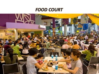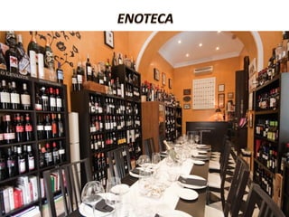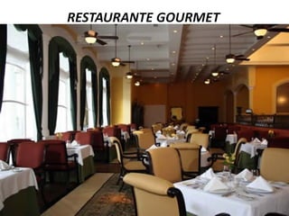 Este documento presenta diferentes tipos de establecimientos donde se sirven alimentos y bebidas, como restaurantes, asaderos de pollos, bistros, restaurantes buffet, cafés, cafeterías, cevicherías, restaurantes de comida rápida, creperías, delicatessen, dinner, drive-ins, enotecas, food courts, friterías, fruterías, restaurantes giratorios, steak houses, piqueteaderos, pizzerías, rodizios, teppanyakis, taquerías, trattorias y vegetarian restaurants.