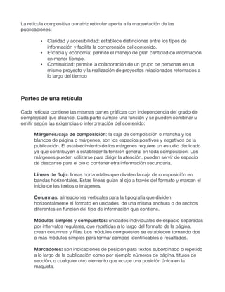 Este documento describe diferentes tipos de retículas utilizadas en la maquetación de publicaciones. Describe retículas de manuscrito, columnas, modulares y jerárquicas, explicando sus características y usos. La retícula de manuscrito es la más simple, con un solo bloque de texto. La retícula de columnas divide la página en columnas verticales. La retícula modular crea una matriz de celdas. La retícula jerárquica se basa en la relación entre los elementos informativos.