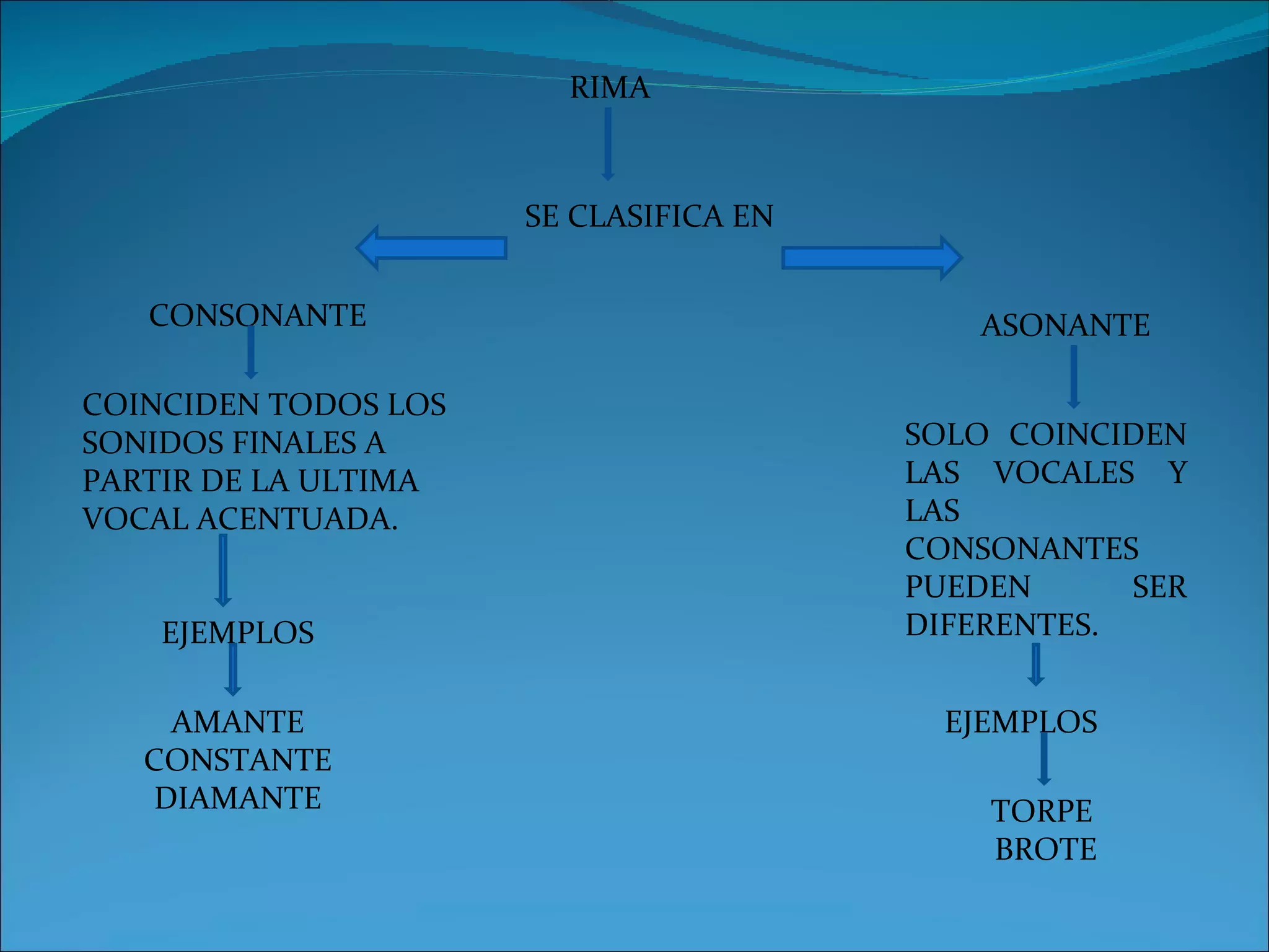 La rima se clasifica en consonante o asonante. La rima asonante coincide todos los sonidos finales a partir de la última vocal acentuada, solo las vocales mientras que las consonantes pueden ser diferentes. Los ejemplos dados son amante, constante, diamante, torpe y brote como rimas asonantes.