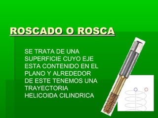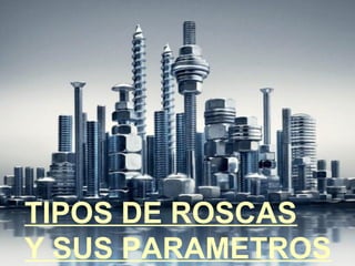 Este documento describe los diferentes tipos de roscas, sus características y clasificaciones. Las roscas se utilizan principalmente para unir o transmitir movimiento entre piezas y tienen elementos como la cabeza, el cuello y la rosca en espiral. Las roscas se clasifican según la forma de los filetes, la dirección de la espiral y su uso, e incluyen roscas triangulares, trapezoidales, redondas y de dientes de sierra. También se describen los sistemas de rosca métrica, whitworth, Sellers