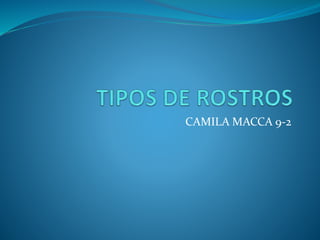 Este documento describe los diferentes tipos de rostros: ovalado, redondeado, cuadrado, alargado, triangular, triángulo invertido, diamante y periforme. Explica las características clave de cada tipo de rostro, incluyendo la forma de la frente, mandíbula, pómulos y barbilla. También menciona que muchos rostros no encajan perfectamente en una forma geométrica y pueden ser una combinación de tipos.