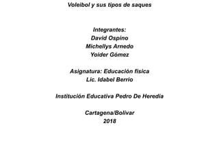Este documento describe los diferentes tipos de saques en voleibol, incluyendo flotante, saque por debajo de frente, saque por debajo lateral, saque de vela, y varios tipos de saques por arriba. Explica las posiciones corporales y los movimientos de brazo requeridos para ejecutar correctamente cada saque. La conclusión es que aprendiendo sobre los diversos tipos de saques se puede mejorar la técnica y evitar lesiones al ejecutarlos de forma inadecuada.