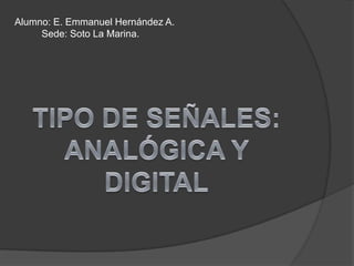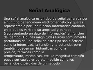 Este documento describe las diferencias entre señales analógicas y digitales. Las señales analógicas representan información de forma continua mediante variaciones en amplitud y periodo en función del tiempo. Las señales digitales representan información mediante valores discretos como 0 y 1. Las señales digitales tienen ventajas como mayor resistencia al ruido y facilidad de recuperación de información frente a las señales analógicas.