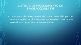Este documento describe varios tipos de sistemas de información, incluyendo sistemas de procesamiento de transacciones, sistemas de apoyo a la toma de decisiones, sistemas de apoyo a la toma de decisiones en grupo, sistemas de trabajo con conocimientos, sistemas de automatización de oficinas, sistemas de información para la administración, y sistemas de información estratégicos. También discute la integración de los sistemas de información en la administración y sus aplicaciones en el campo laboral.