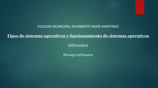 Este documento explica los tipos y el funcionamiento de los sistemas operativos. Describe los sistemas operativos como programas que administran los recursos de una computadora y facilitan la interacción entre hardware, software y usuario. Explica que los sistemas operativos se pueden clasificar como monotarea o multitarea, y monousuario o multiusuario. También enumera cinco funciones clave de los sistemas operativos como la administración de procesadores, memoria, entradas/salidas, aplicaciones y archivos.