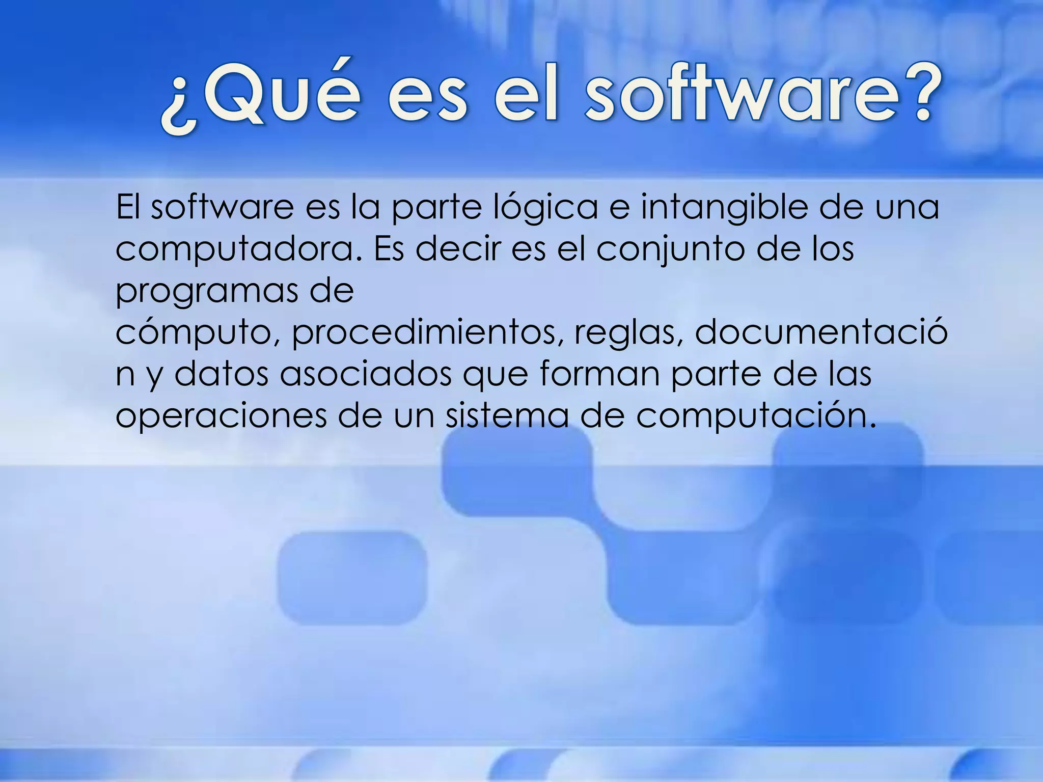 El documento describe los diferentes tipos de software, incluyendo software de sistema, software de aplicación, software de programación, software de tiempo real, software de gestión, software científico y de ingeniería, software empotrado e inteligencia artificial. Un ejemplo de software de inteligencia artificial es Smart Airport Operations Center, un programa de logística utilizado en aeropuertos para resolver problemas complejos.