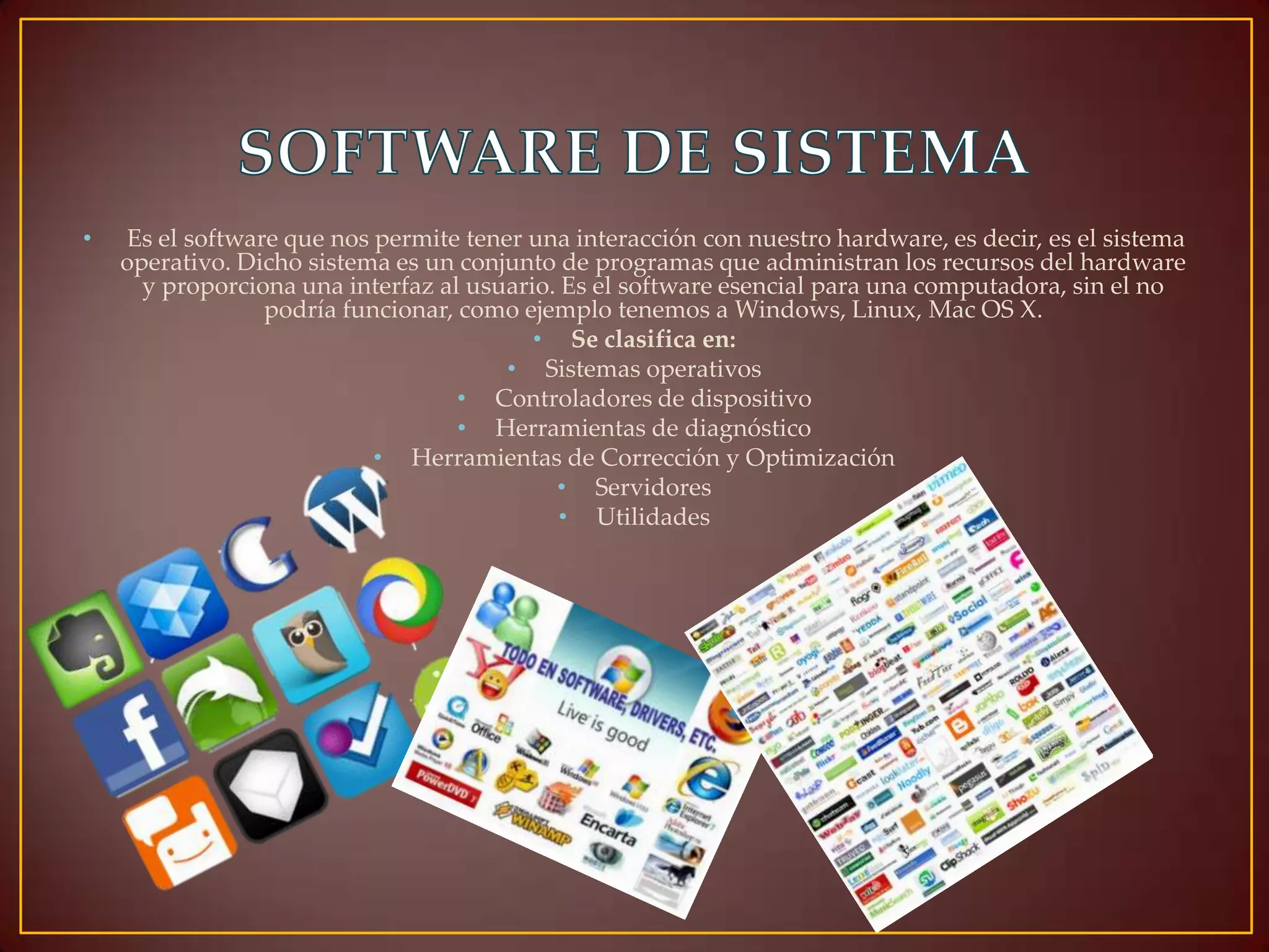 El documento describe tres tipos de software: software de sistema, que incluye el sistema operativo y controladores necesarios para hacer funcionar la computadora; software de programación, como editores y compiladores, que permiten a los programadores crear nuevos programas; y software de aplicación, como procesadores de texto y hojas de cálculo, que permiten a los usuarios realizar tareas específicas.