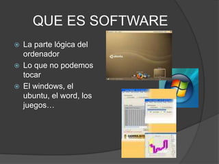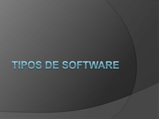 El documento describe tres tipos principales de software: software de sistema, que incluye el sistema operativo y controladores necesarios para el funcionamiento del hardware; software de aplicaciones, desarrollado para realizar funciones específicas en un sistema operativo determinado; y software de usuario, que comprende los archivos y datos creados por el usuario como documentos, fotos y música.