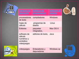 Este documento clasifica y describe tres tipos de software: software de aplicación, software de programación y software de sistema. El software de aplicación permite a los usuarios realizar tareas específicas como procesamiento de texto, hojas de cálculo, editores y más. El software de programación incluye herramientas como compiladores y editores que los programadores usan para desarrollar software. El software de sistema, como Windows, Linux y Mac OS X, administra los recursos del hardware y proporciona una interfaz para que los usuarios interactúen y controlen el sistema operativo.