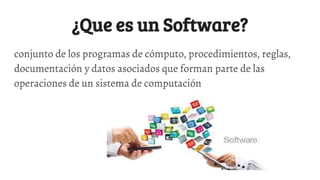 Este documento describe tres tipos principales de software: software de sistema como Windows y Linux, software de programación como editores de texto y compiladores, y software de aplicación como procesadores de texto, hojas de cálculo y programas de comunicaciones. Proporciona ejemplos de software populares para cada categoría.