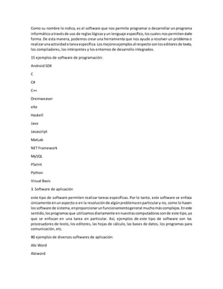 Existen 3 tipos principales de software: software de sistema, software de programación y software de aplicación. El software de sistema incluye sistemas operativos como Windows, Linux y Mac OS y proporciona una interfaz para interactuar con el hardware. El software de programación permite crear programas a través de lenguajes de programación como Java, Python y C++. El software de aplicación se enfoca en tareas específicas como procesadores de texto, hojas de cálculo y programas de comunicación.