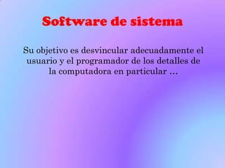 El documento describe tres tipos de software: el software de sistema, que desvincula a usuarios y programadores de los detalles de la computadora; el software de programación, que permite a los programadores desarrollar programas; y el software de aplicación, que permite a los usuarios llevar a cabo tareas específicas en campos como los negocios.
