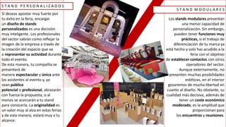 El documento describe diferentes tipos de stands que pueden utilizarse en ferias. Menciona stands personalizados, modulares, itinerantes, audiovisuales, custom, portátiles y creativos. También describe stands medianeros, esquineros e islas; y explica brevemente las ventajas y desventajas de cada tipo. Finalmente, presenta una tabla sobre zonificación.