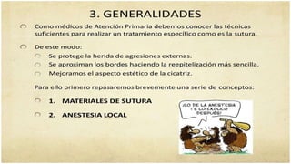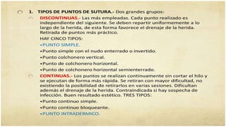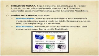 El documento aborda los principios básicos de las suturas en cirugía, describiendo diversos tipos de suturas absorbibles y no absorbibles, junto con sus características específicas como tiempo de absorción y aplicación en diferentes regiones corporales. También se detallan las agujas utilizadas, la técnica de sutura y la importancia de mantener un campo estéril para evitar complicaciones. Además, se mencionan complicaciones asociadas al cierre de heridas y técnicas para realizar suturas estéticas efectivas.