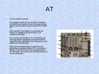 El documento describe los diferentes tipos de factores de forma para tarjetas madre, incluyendo AT, Baby AT, LPX y ATX. El tipo AT se ajusta a gabinetes grandes, mientras que Baby AT es una versión más pequeña compatible con más gabinetes. LPX introdujo ranuras montadas lateralmente para permitir gabinetes más delgados. ATX es el más reciente, girando la tarjeta y modificando la ubicación de la fuente de poder para requerir nuevos gabinetes y fuentes de poder.