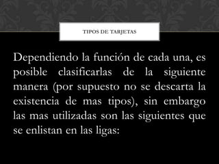 El documento describe los diferentes tipos de tarjetas de expansión utilizadas en computadoras, incluyendo tarjetas de red, gráficos, sonido y más. Explica las características, especificaciones y estándares asociados con cada tipo de tarjeta.