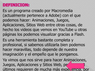 El documento define Flash como un programa creado por Macromedia (ahora propiedad de Adobe) que permite crear animaciones, juegos, aplicaciones y sitios web. Explica que Flash surgió en 1996 como una herramienta de animación y que con el tiempo se convirtió en un complemento estándar de los navegadores web gracias a sus características y capacidades. Resalta que Flash es una herramienta versátil y potente que permite crear contenido multimedia interactivo para la web u otros usos si se utiliza de manera creativa.
