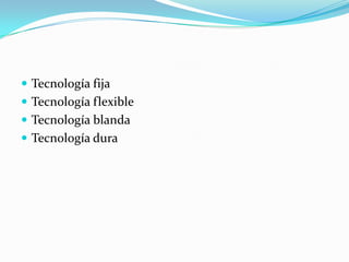Este documento define y explica cuatro tipos de tecnología: fija, flexible, blanda y dura. La tecnología fija se refiere al conocimiento técnico que no puede usarse para otros fines, mientras que la tecnología flexible puede aplicarse de varias maneras. La tecnología blanda incluye conocimientos de planificación y administración, no técnicos. Finalmente, la tecnología dura se centra exclusivamente en conocimientos técnicos aplicados a la producción.