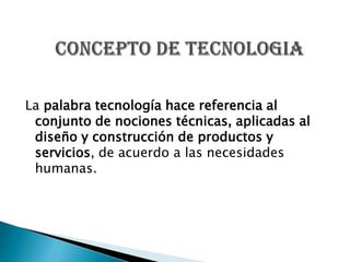 El documento define varios tipos de tecnología. La tecnología se refiere al conjunto de conocimientos técnicos aplicados al diseño de productos y servicios según las necesidades humanas. La tecnología fija no cambia continuamente, mientras que la tecnología de proceso incluye habilidades y conocimientos aplicados a un producto en particular. La tecnología limpia no produce modificaciones ambientales.