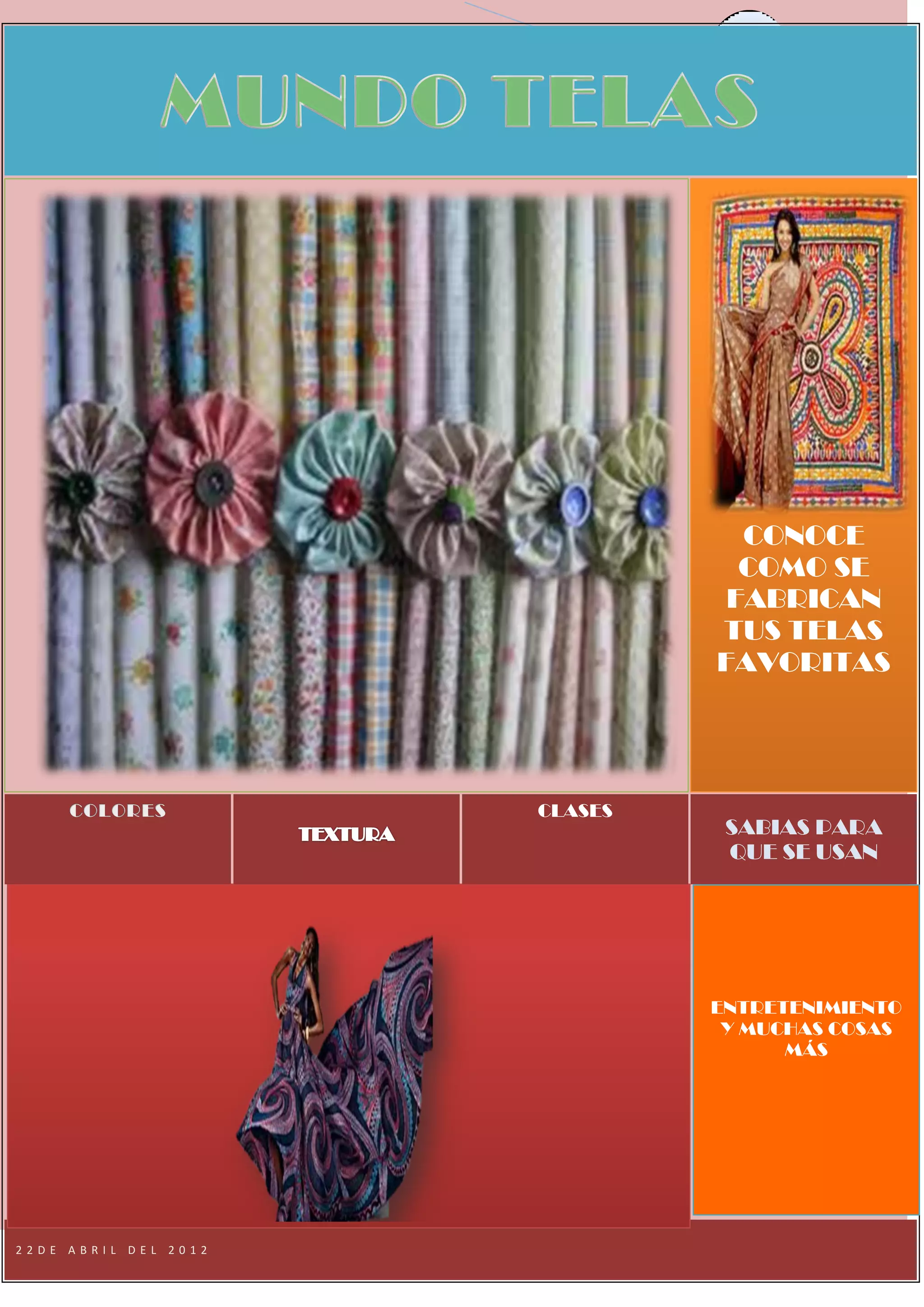 Este documento proporciona información sobre los procesos de fabricación de telas. Explica cómo se producen las telas tejidas utilizando telares y los equipos involucrados como tejedoras automáticas controladas por computadora. También describe los procesos para producir telas no tejidas y los equipos como secadores de tambor. Finalmente, detalla los insumos clave requeridos como fibras naturales, artificiales y sintéticas y cómo se clasifican y componen los diferentes tipos de telas.