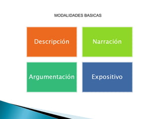 El documento describe los diferentes tipos de textos y sus modalidades. Identifica los textos literarios, científicos, humanísticos, jurídicos, administrativos, periodísticos y publicitarios como las modalidades básicas. Dentro de la narración, explica que consiste en contar hechos reales o ficticios y que puede adoptar una perspectiva objetiva o subjetiva, así como diferentes posiciones y movimientos como la visión pictórica, cinematográfica o topográfica. Finalmente, señala que los textos tienen