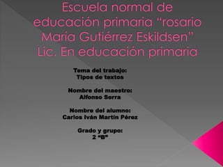 El resumen presenta los diferentes tipos de textos que se analizan en el documento como fragmentos de novelas, cuentos, reseñas, artículos periodísticos, noticias, manuales de instrucciones, resúmenes y listas de datos. El documento proporciona ejemplos de cada tipo de texto y explica que el objetivo es enseñar a los estudiantes a escribir de manera correcta y estructurada según el género.