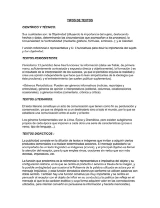 El documento describe diferentes tipos de textos, incluyendo textos científicos y técnicos, periodísticos, literarios, didácticos, históricos e informativos. Los textos científicos y técnicos se caracterizan por su objetividad, universalidad y verificabilidad. Los textos periodísticos tienen la función de informar, formar y entretener a través de géneros como noticias y reportajes. Los textos literarios buscan comunicarse con lectores de todas las épocas a través de géneros como lírica,