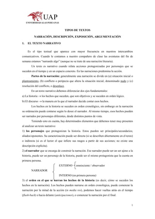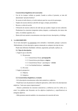 Este documento describe los principales tipos de textos: narrativo, descriptivo, expositivo y argumentativo. Explica las características de cada uno, incluyendo su estructura, elementos, orden cronológico de los hechos narrados, y uso del lenguaje como verbos, tiempos verbales, y conectores. Los textos narrativos cuentan historias de personajes y acciones, mientras que los descriptivos describen personas, lugares y procesos. Los expositivos explican temas de forma objetiva, y los argumentativos usan razones para defender una