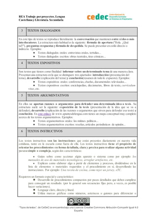 El documento trata sobre los diferentes tipos de textos en lengua castellana y literatura, clasificados en narrativos, descriptivos, dialogados, expositivos, argumentativos e instructivos. Cada tipo se caracteriza por su estructura y propósito específico, como narrar hechos, describir objetos o personas, transmitir conversaciones, informar sobre un tema, argumentar ideas o dar instrucciones. Proporciona ejemplos tanto orales como escritos para cada tipo de texto, resaltando su importancia en la comunicación diaria.