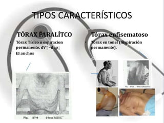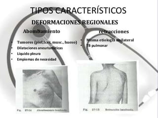 Este documento describe diferentes tipos de deformidades del tórax, incluyendo deformidades congénitas como el tórax acanalado, piramidal y piriforme, así como deformidades adquiridas como resultado de la obstrucción nasal crónica, raquitismo, enfisema y cifoescoliosis. También se mencionan algunas anomalías de la piel y el esqueleto óseo del tórax.