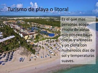 Este documento describe los diferentes tipos de turismo, incluyendo el turismo de playa, deportivo, de aventura, de naturaleza como el ecoturismo y rural, artístico-cultural, de balneario que se desarrolla en áreas con manantiales medicinales, y de congresos que implica asistir a eventos como congresos y convenciones.