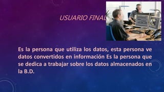 El documento describe los diferentes tipos de usuarios que interactúan con una base de datos, incluyendo usuarios finales, administradores de base de datos (DBA), usuarios casuales, usuarios ingeniosos, programadores de aplicaciones y administradores de base de datos. Cada tipo de usuario tiene diferentes niveles de acceso y responsabilidades en relación con la gestión y uso de los datos almacenados en la base de datos.