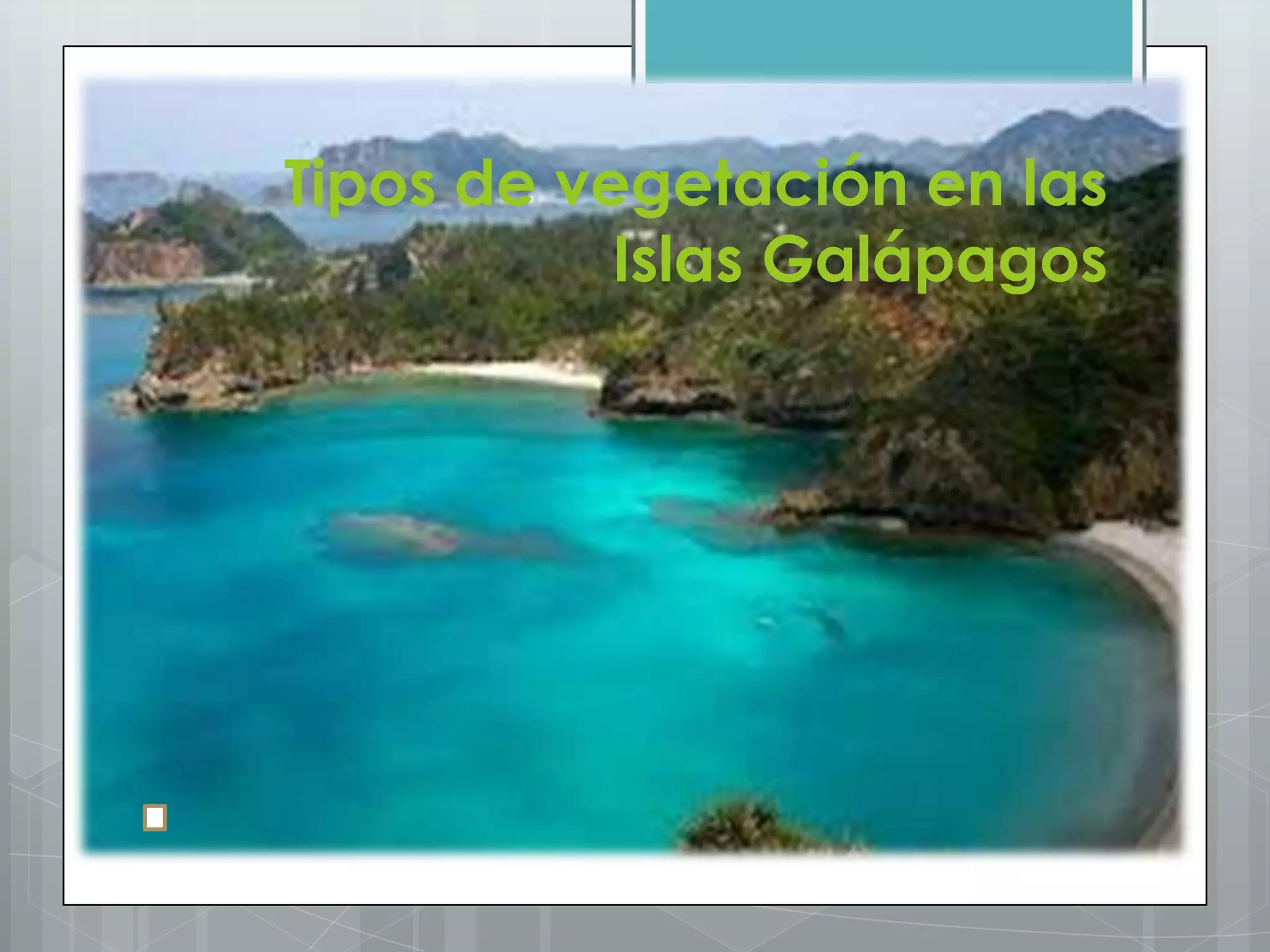 El documento describe los cinco tipos principales de vegetación que se encuentran en las Islas Galápagos. Estos incluyen la zona litoral, compuesta principalmente de mangles; la zona árida con arbustos xéricos como cactus y chala; la zona de Scalesia dominada por bosques nublados; la zona de Miconia con arbustos bajos y densos; y la zona alpina de helechos, gramíneas y ciperáceas. Cada zona alberga especies nativas únicas y muchas son end
