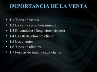 Este documento describe diferentes tipos de ventas como la venta al mayoreo, la venta al detalle, la venta por ruteo, la venta de servicios y la venta a domicilio. Explica que la venta al mayoreo implica la venta de grandes cantidades de productos a otros comerciantes y no directamente a los consumidores finales, mientras que la venta al detalle es la venta directa a los consumidores finales. También señala las características clave de la venta al detalle como que el cliente puede ver la variedad