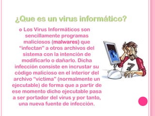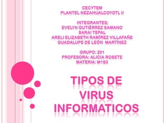 El documento describe diferentes tipos de virus informáticos, incluyendo gusanos que se duplican en la memoria del sistema, caballos de Troya que se esconden en programas legítimos para dañar la computadora, bombas lógicas que se activan en ciertas fechas u ocasiones, y hoaxes que no son verdaderos virus sino mensajes falsos diseñados para sobrecargar las redes. También menciona virus de enlace que cambian las direcciones de los archivos, de sobreescritura que eliminan el contenido de los archivos, y resident
