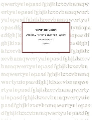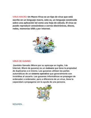 El documento describe dos tipos principales de virus informáticos: virus macro y virus de gusano. Un virus macro se reproduce adjuntándose a correos electrónicos, discos, redes o memorias USB, y está escrito en un lenguaje de macros como una hoja de cálculo. Un virus de gusano, también llamado IWorm, se duplica a sí mismo y se propaga de computadora a computadora sin necesidad de interacción humana, aprovechando funciones automáticas del sistema operativo.