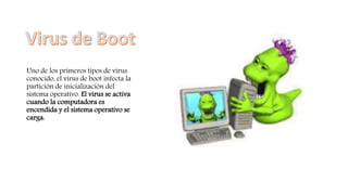 El documento describe diferentes tipos de malware como virus, gusanos, troyanos, hijackers, keyloggers y estados zombie. Explica que los virus de boot infectan la partición de inicio y se activan al encender la computadora, mientras que los virus de bomba de tiempo están programados para activarse en momentos específicos. También describe cómo los gusanos y troyanos se replican y transmiten sin causar daños aparentes, y cómo los keyloggers y hijackers roban información personal e impiden el acceso a sitios web.