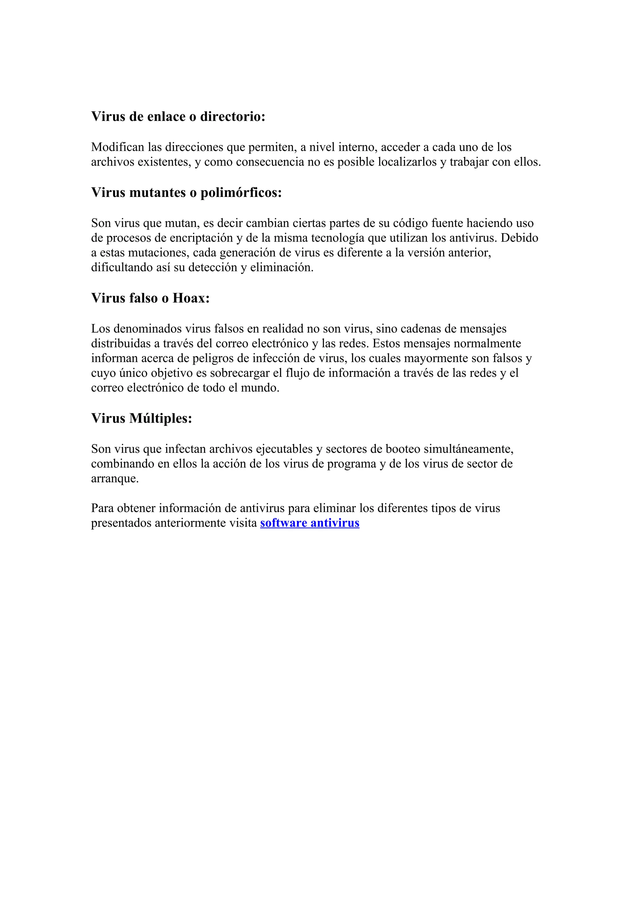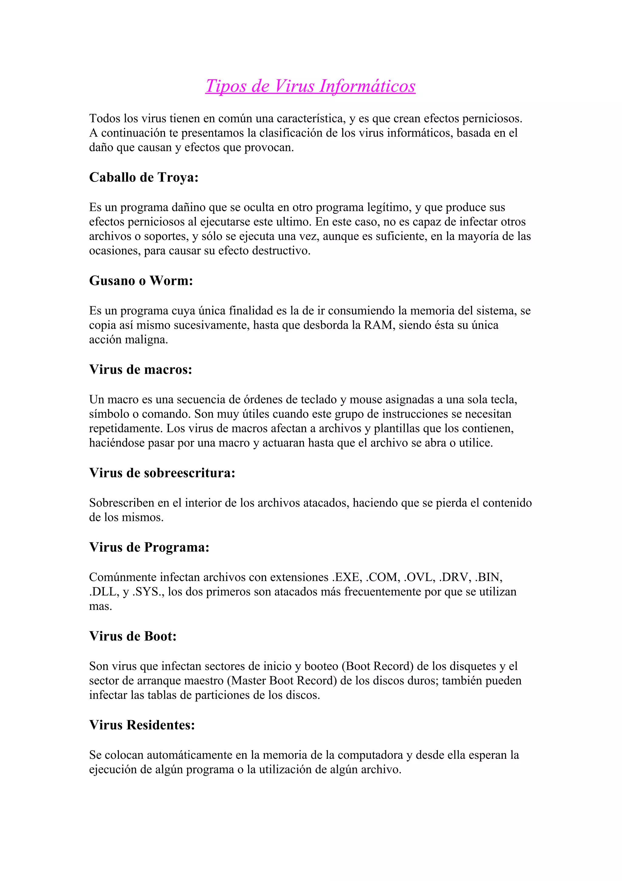 Este documento clasifica y describe los diferentes tipos de virus informáticos basados en el daño que causan y sus efectos. Describe caballos de Troya, gusanos, virus de macros, virus de sobreescritura, virus de programa, virus de boot, virus residentes, virus de enlace o directorio, virus mutantes o polimórficos, virus falsos o hoaxes y virus múltiples.