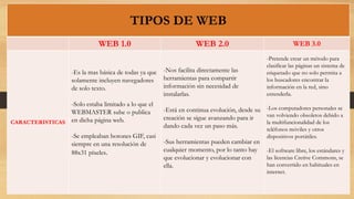 Este documento describe las características de tres tipos de web: Web 1.0, Web 2.0 y Web 3.0. La Web 1.0 se limitaba a páginas de solo texto controladas por el webmaster. La Web 2.0 facilita compartir y actualizar información a través de herramientas en línea. La Web 3.0 pretende clasificar y entender páginas a través de etiquetas semánticas.